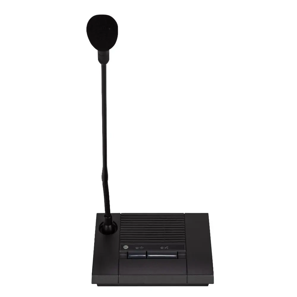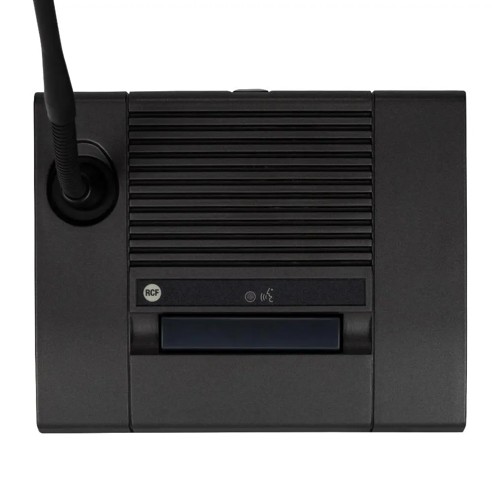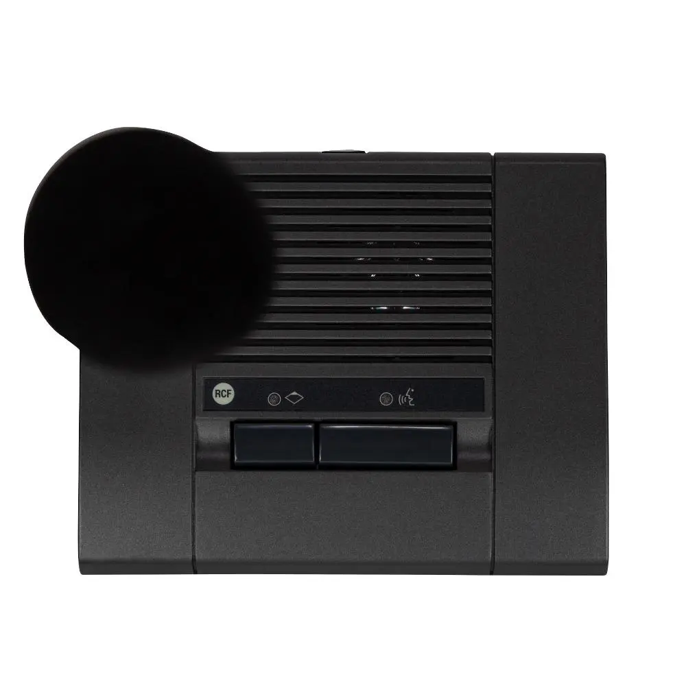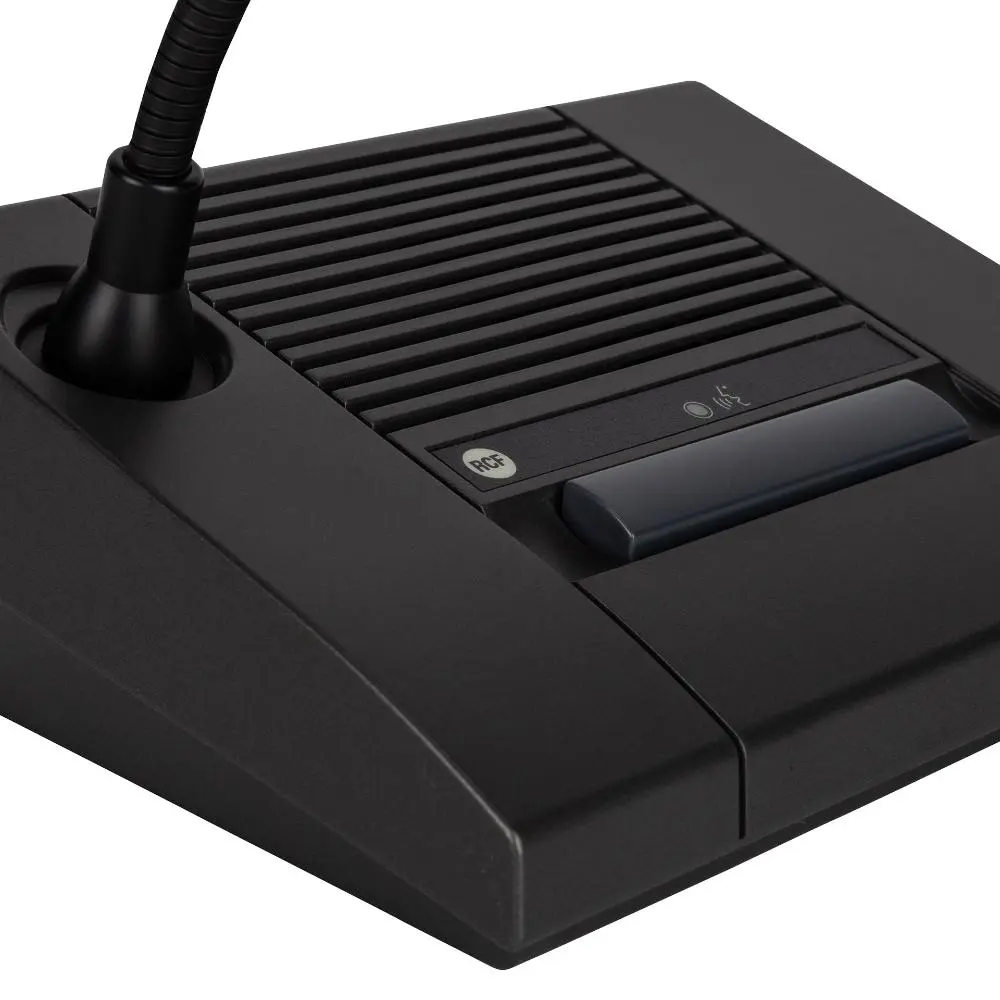 The desk-top chairman microphone console MMS 3405P features two buttons: a latched button to enable the microphone in mixed mode with other active MMS 3404D delegate microphone consoles, and a momentary push button to get the microphone working in priority mode on delegate ones, that stay off till the button has been is released. This function allows the chairman to take the absolute control of the speech. Each button is completed with a LED indicator, lit when pressed. Furthermore the microphone capsule has an LED ring that is ON when the microphone is active. The 46 cm gooseneck microphone mounted on the console has a cardioid pattern, while the miniature high quality transducer assures a good sound reinforcement in small size rooms without needing an additional sound reinforcement system. Two or more MMS 3405P can be cascaded by keeping cascaded priority precedence, over than preserving mixed speech option facility. MMS 3405P is wired directly to the dedicate input of the MMU 3100 unit by means of CAT 5FTP cable provided.