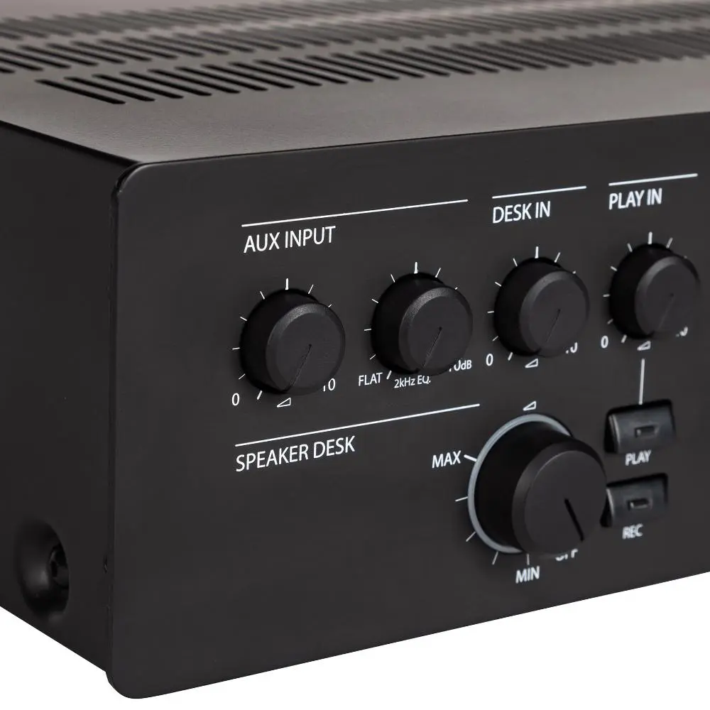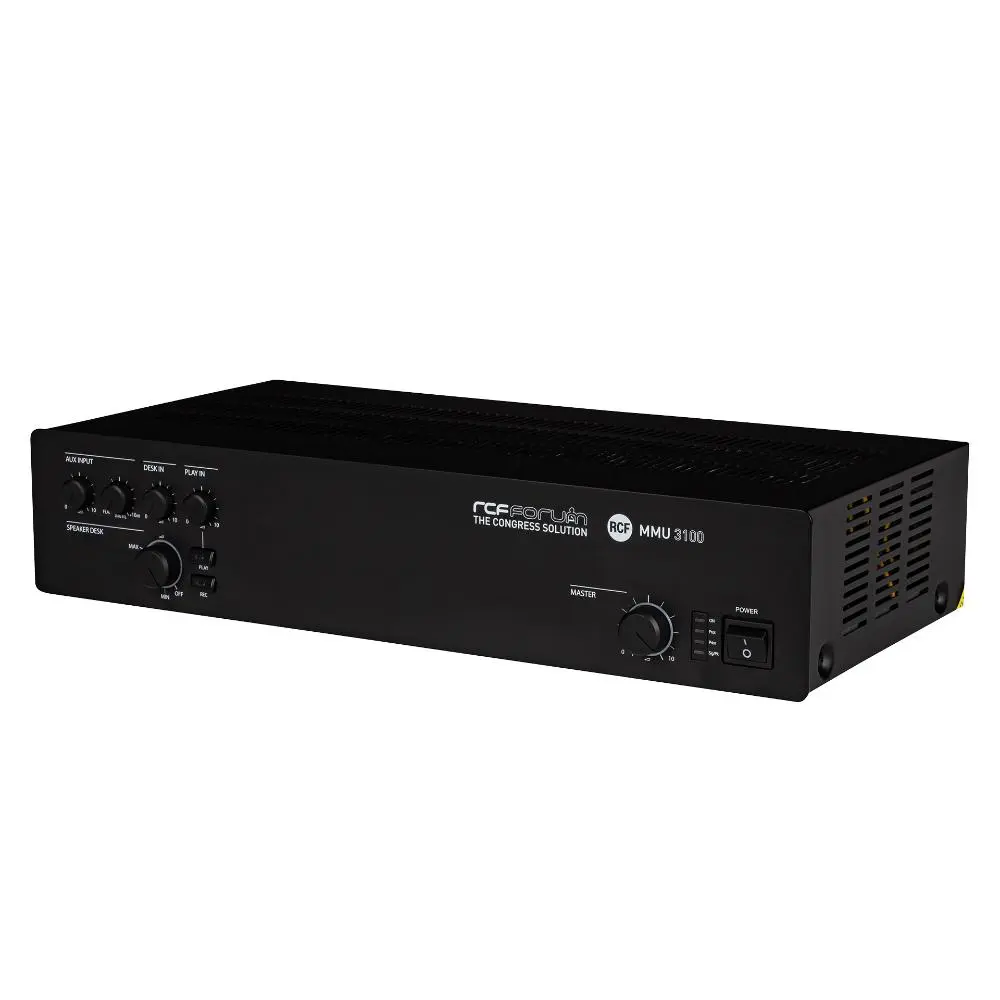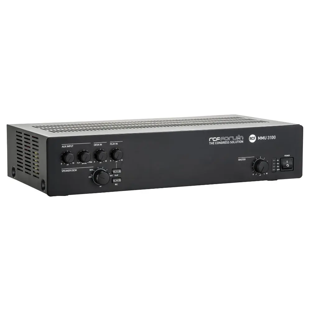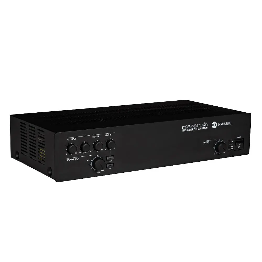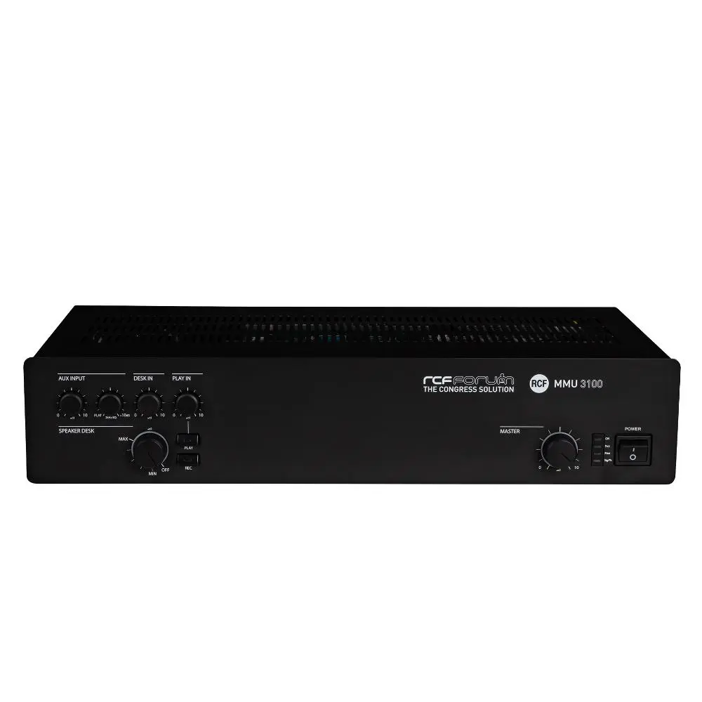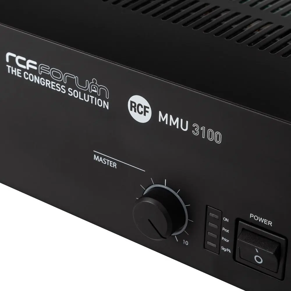 The MMU 3100 master unit includes all the features necessary to set-up a meeting for up to 80 microphone sets. Recording output and playback input are present as well, together with a dedicated input and output for teleconference system interfacing. The unit is able to provide 80W on its 100V or 70V output for the connection of additional sound reinforcement speakers present in the room. One line level output is available too, for the link to an independent sound reinforcement system. User controls are on front panel and include volume levels for inputs and powered outputs, directed to the reinforcement speakers integrated in each microphone console and to the ones connected to the amplifier direct output. Two devices MMU 3100 can be linked through a dedicated port, to expand the number of the delegate microphones to 160.