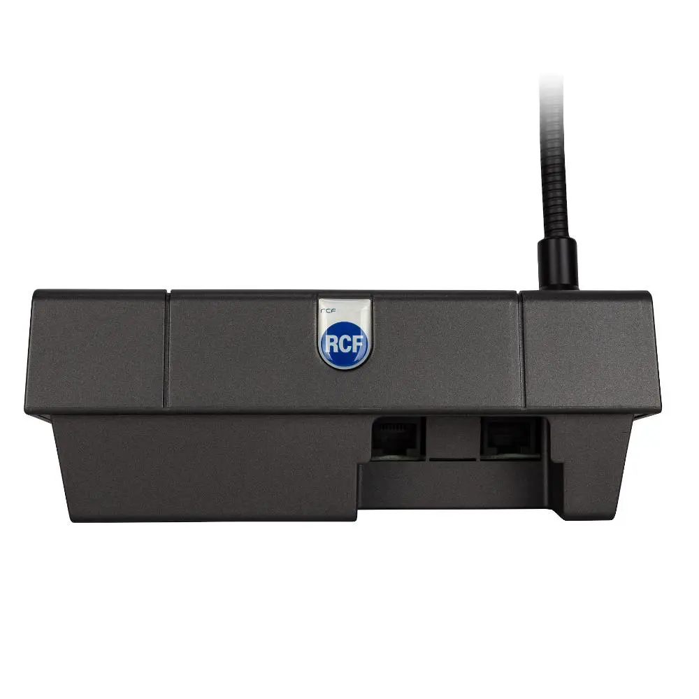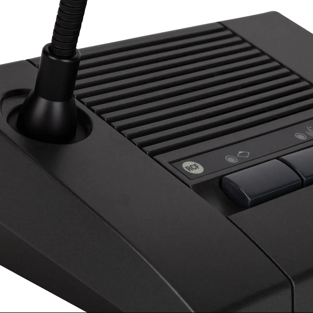 The desktop delegate microphone set MMS 3404D features a latched button to enable the microphone in mixed mode with other active MMS 3404D and MMS 3405P (if no priority button has been pressed on chairman’s set). The button is completed with a LED indicator, lit when pressed. Furthermore the microphone capsule has a LED ring that is ON when the microphone is active. The 46 cm gooseneck microphone mounted on the console has a cardioid pattern, while the miniature high quality transducer assures a good sound reinforcement in small size rooms without needing an additional sound reinforcement system. MMS 3404D are cascaded directly to one or both inputs available on MMS 3405P, by means of CAT 5FTP cable provided.